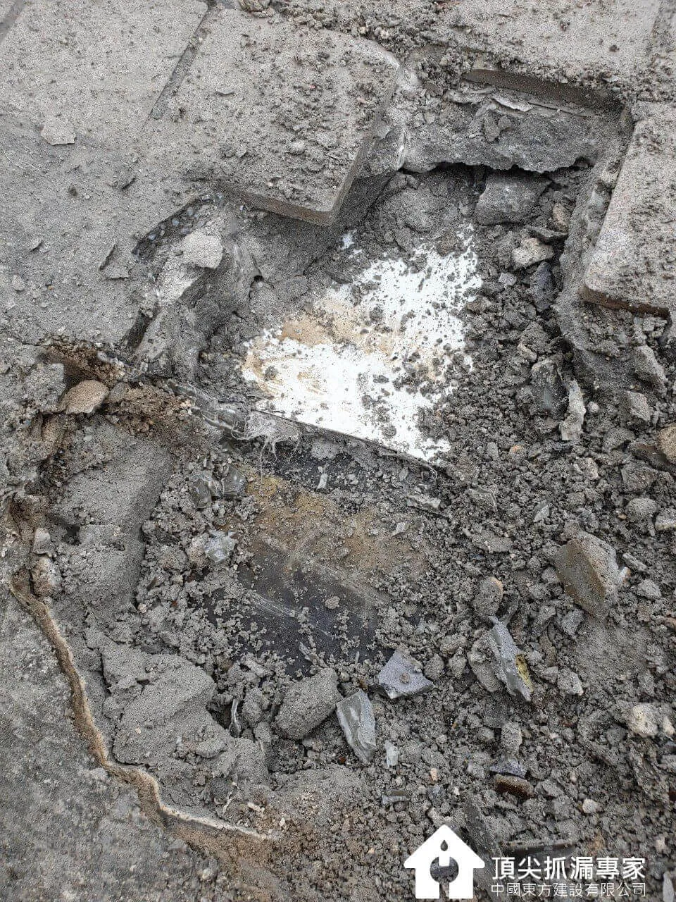 再打下去發現完全沒有防水層,難怪業主長期遭受漏水困擾。